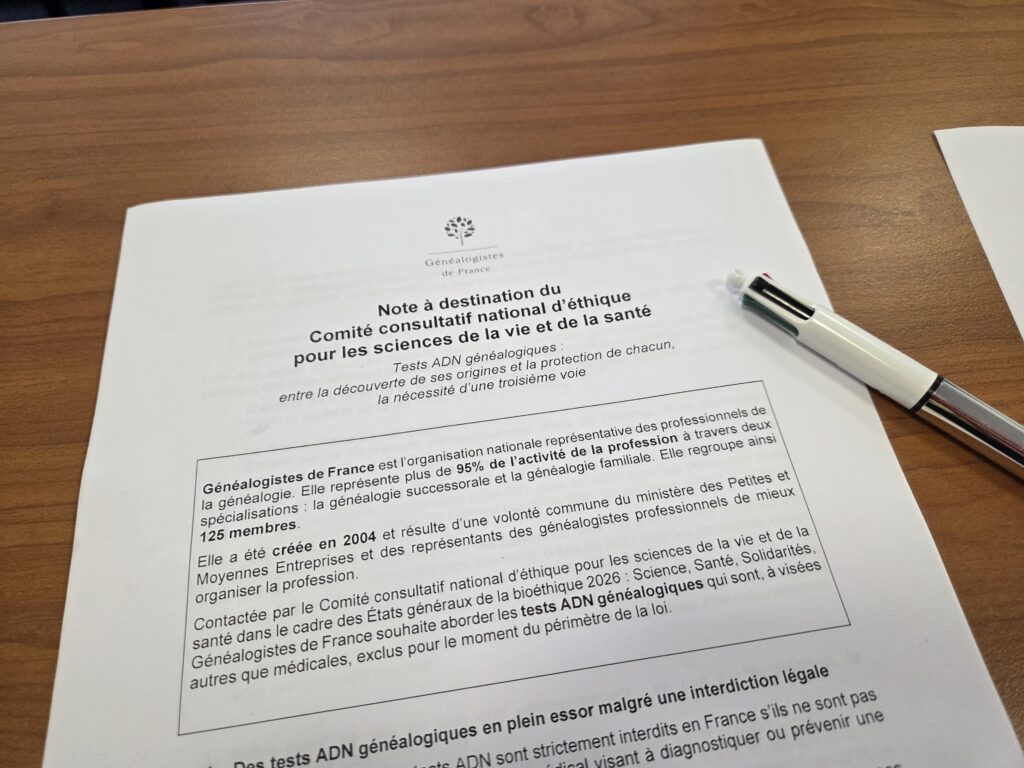 Dans le cadre des « États généraux de la bioéthique 2026 : Science, Santé, Solidarités », Généalogistes de France a été auditionnée le mardi 10 février 2026 sur les tests ADN généalogiques. Interdits en France, ces tests ADN, dits aussi récréatifs, pourraient faire l’objet d’une légalisation prochaine et c’est du point de vue professionnel que se sont ainsi exprimés Cédric Dolain, Président, et Margaux Delaunay, Secrétaire générale, sur le sujet.